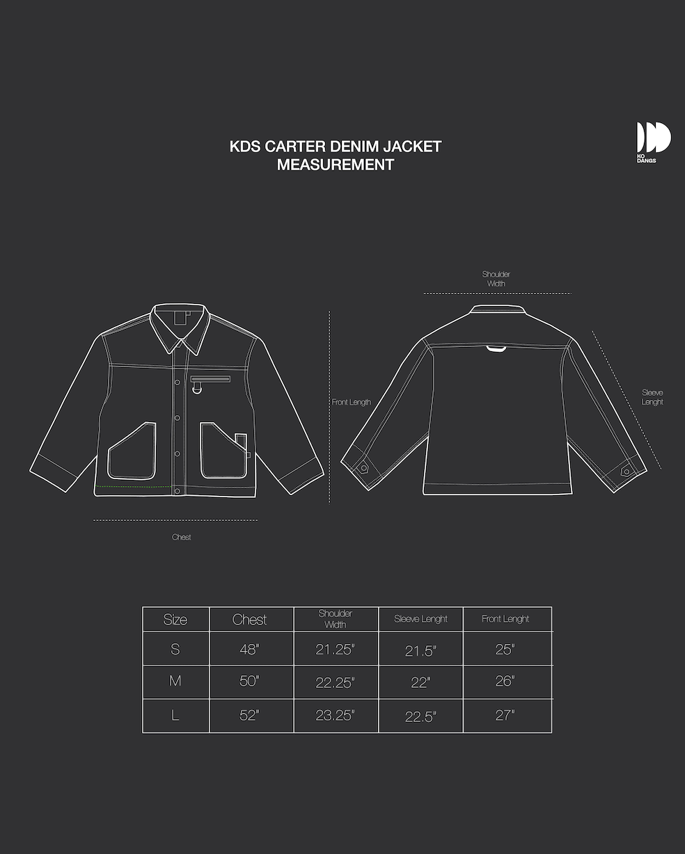 The Carter Denim Jacket in Black fits with a relaxed, boxy silhouette and runs slightly large. If you prefer a cleaner, more fitted look, sizing down one is recommended. Refer to the size guide image below for exact chest and length measurements by size.